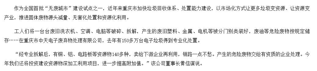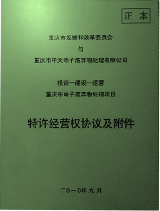 從2010年開始,公司就是重慶市政府公開招投標(biāo)確定的重慶市電子廢棄物處理特許經(jīng)營權(quán)企業(yè),在重慶市“一小時(shí)經(jīng)濟(jì)圈”范圍內(nèi)23個(gè)區(qū)縣,開展電子廢棄物綜合回收機(jī)處理處置業(yè)務(wù)。
